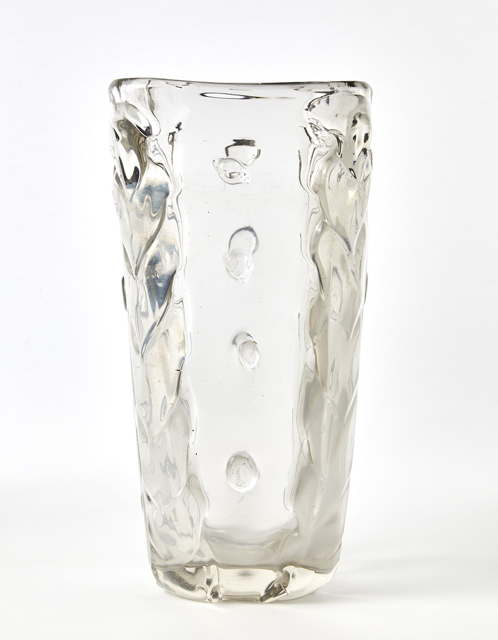 Vaso a sezione quadrata in vetro soffiato incolore con applicazioni a caldo a rilievo. Anni '30/'40. (h cm 36) (lievi difetti)
