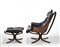 Poltrona con poggiapiedi modello "Falcon Chair". Produzione Vatne Mobler, Norvegia, anni '70. Struttura in legno multistrato curvato, seduta con cuscini rivestiti in pelle nera. (cm 56x40x56) (lievi difetti)
