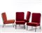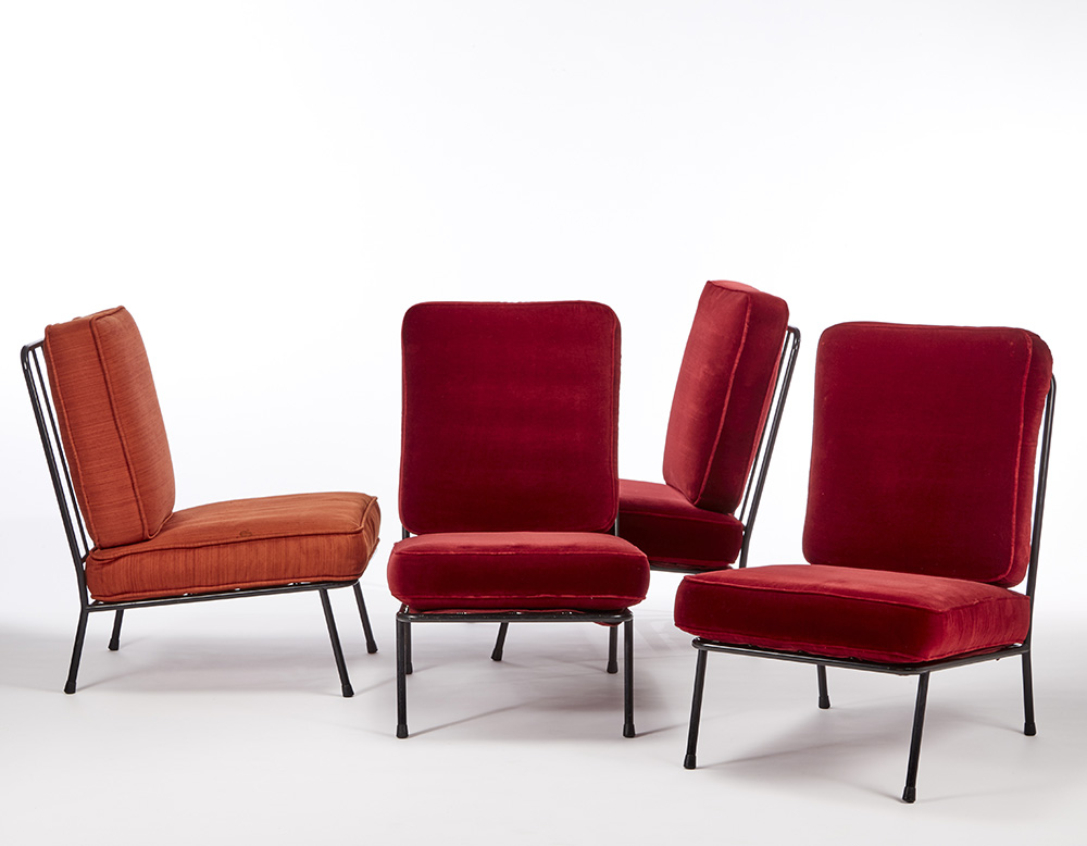 Quattro poltrone con struttura in tubolare metallico piegato e saldato, laccato in nero lucido. Cuscini rivestiti in velluto color porpora e tessuto arancione. Italia, anni '50/'60. (cm 52x80x63) (lievi difetti e restauri)