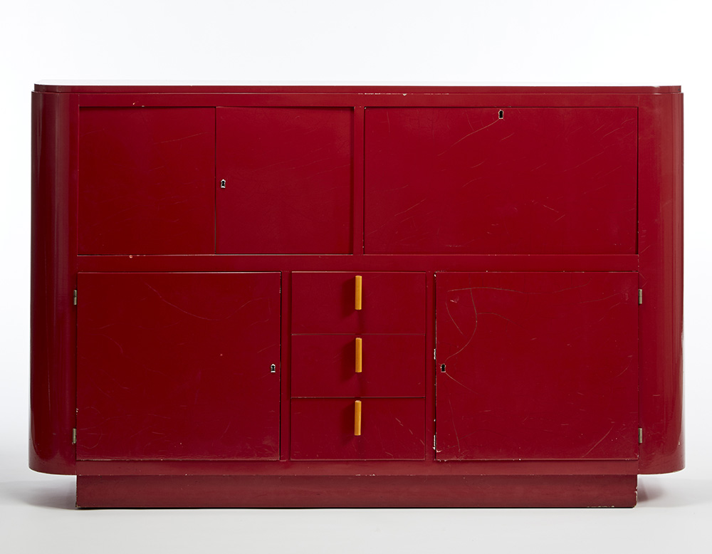 Modernist sideboard in red lacquered wood with yellow bakelite handles. 1920s/1930s. (198x124.5x39.5 cm.) (defects and restorations)