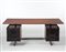Scrivania modello "USC655". Produzione Rima, Padova, 1958. Struttura in tubo d'acciaio opaco, piano in legno teak con bordatura in metallo, due cassettiere in palissandro indiano con cassetti in resina fenolica e stampo. (cm 185x75x84,5) (lievi difetti)