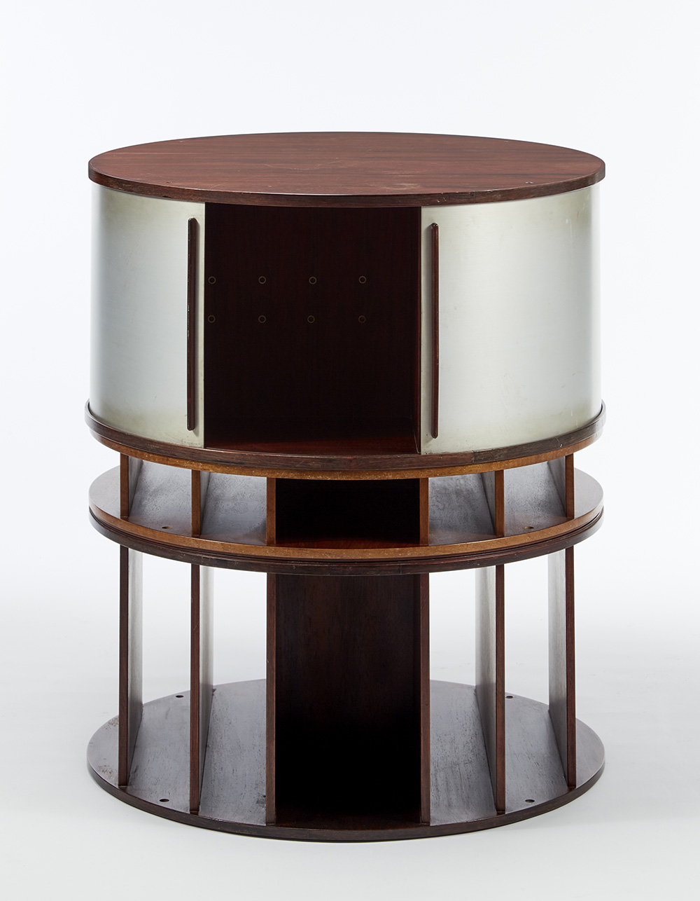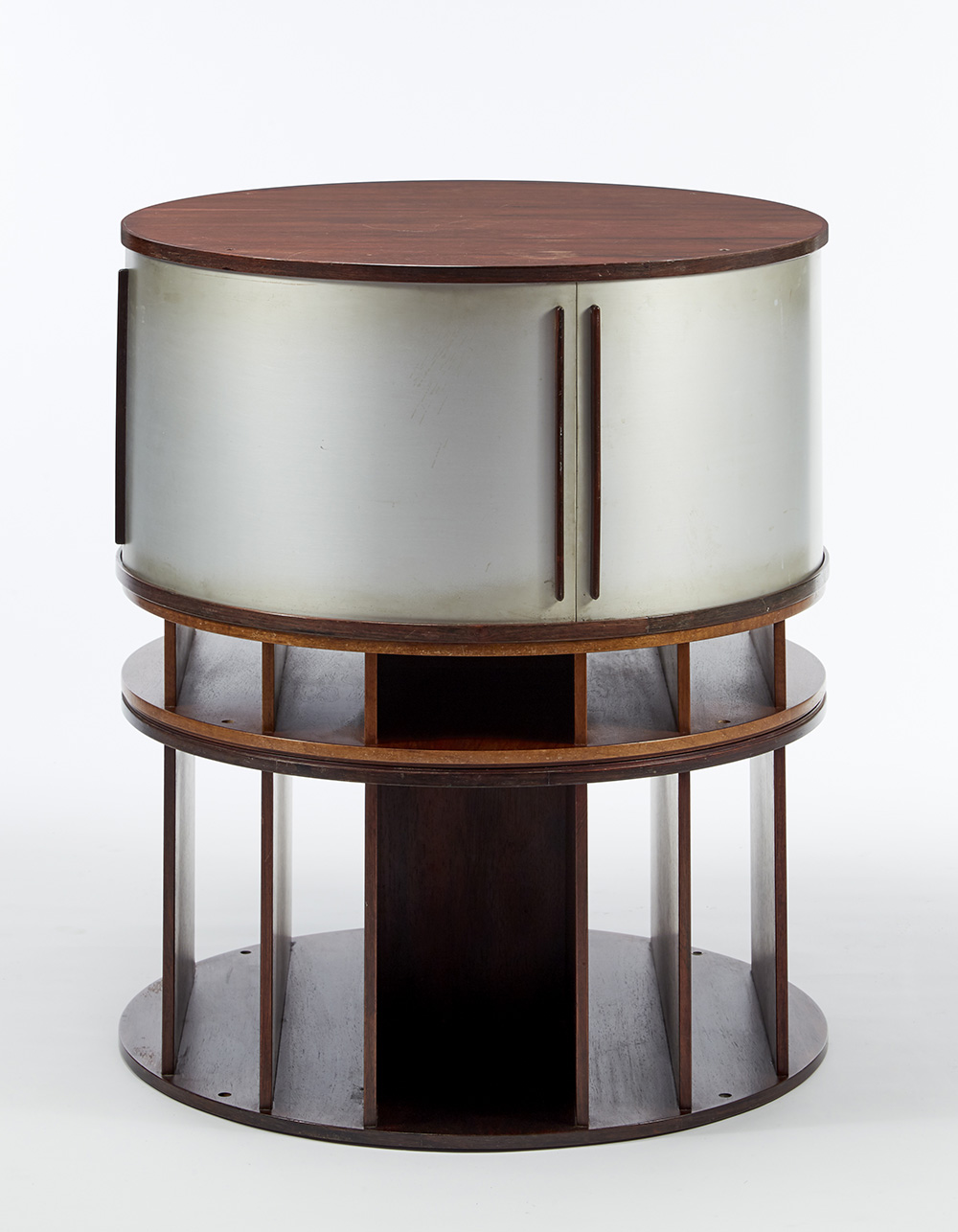 Three cylindrical elements which can be stacked and rotated one on the other equipped with a container and a bookcase model "Combi Center". Execution by Bernini, Italy, 1963/1964. Aluminum and veneered Indian rosewood. Silver medal at the 13th Milan Triennale of 1964. (h 95.5 cm.; d 84 cm.) (defects and losses)