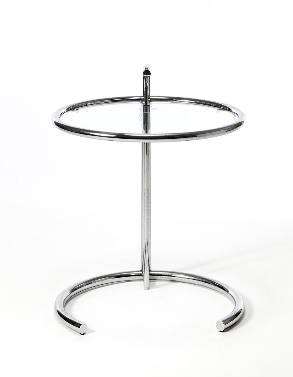 Tavolino da appoggio modello "E 1027". Produzione Alivar, Disegno 1927/1929. Struttura in acciaio cromato e piano in cristallo. (h cm 63; d cm 51) (lievi difetti)