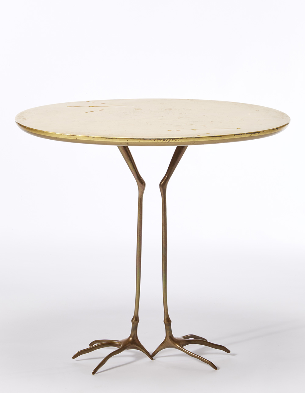 Tavolino modello "Traccia". Produzione Simon, Vicenza, Disegno 1936. Gambe in bronzo conformate a zampa di uccello trampoliere, piano in legno dorato. (cm 68x63,5x53) (lievi difetti)