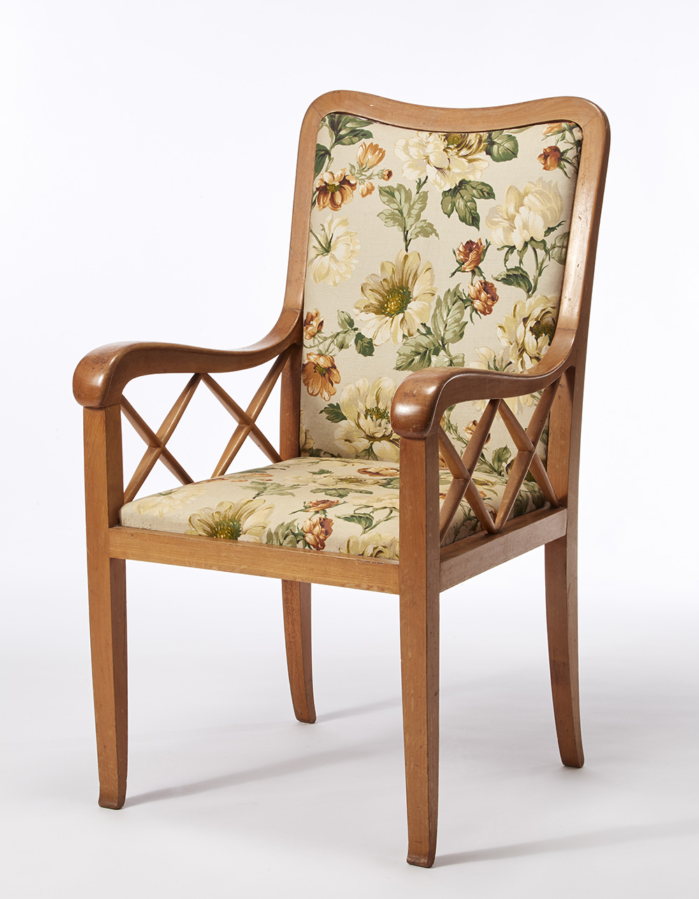 Poltrona in legno chiaro massello, con montanti sagomati e fianchi a listelli incrociati. Italia, 1940ca. (cm 57,5x100,5x62)