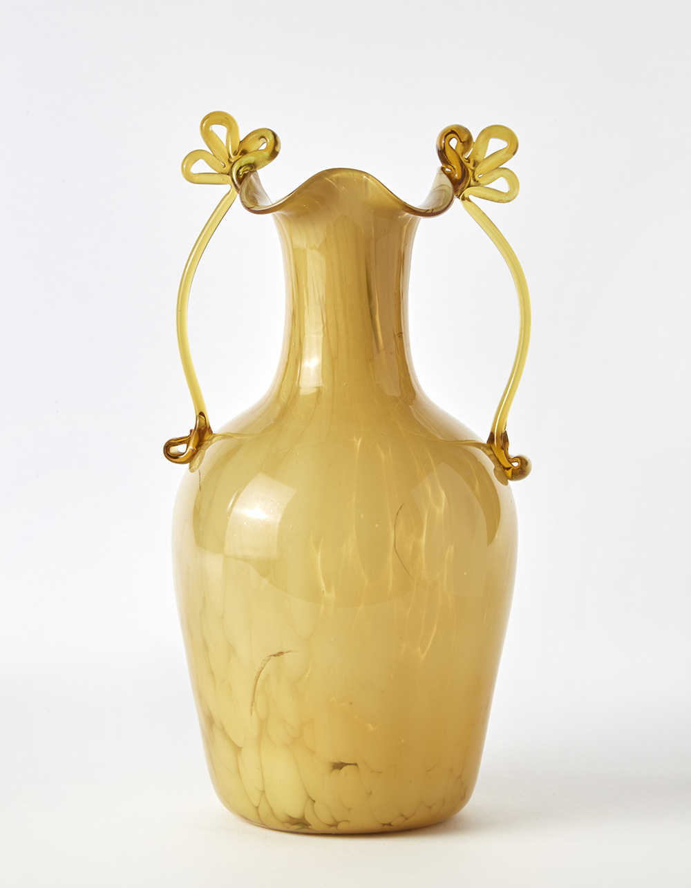Vaso biansato con orlo ondulato ed anse a riccioli. Anni '20/'30. Vetro soffiato pagliesco trasparente decorato con macchie in vetro lattimo. (h cm 35) (gravi difetti)