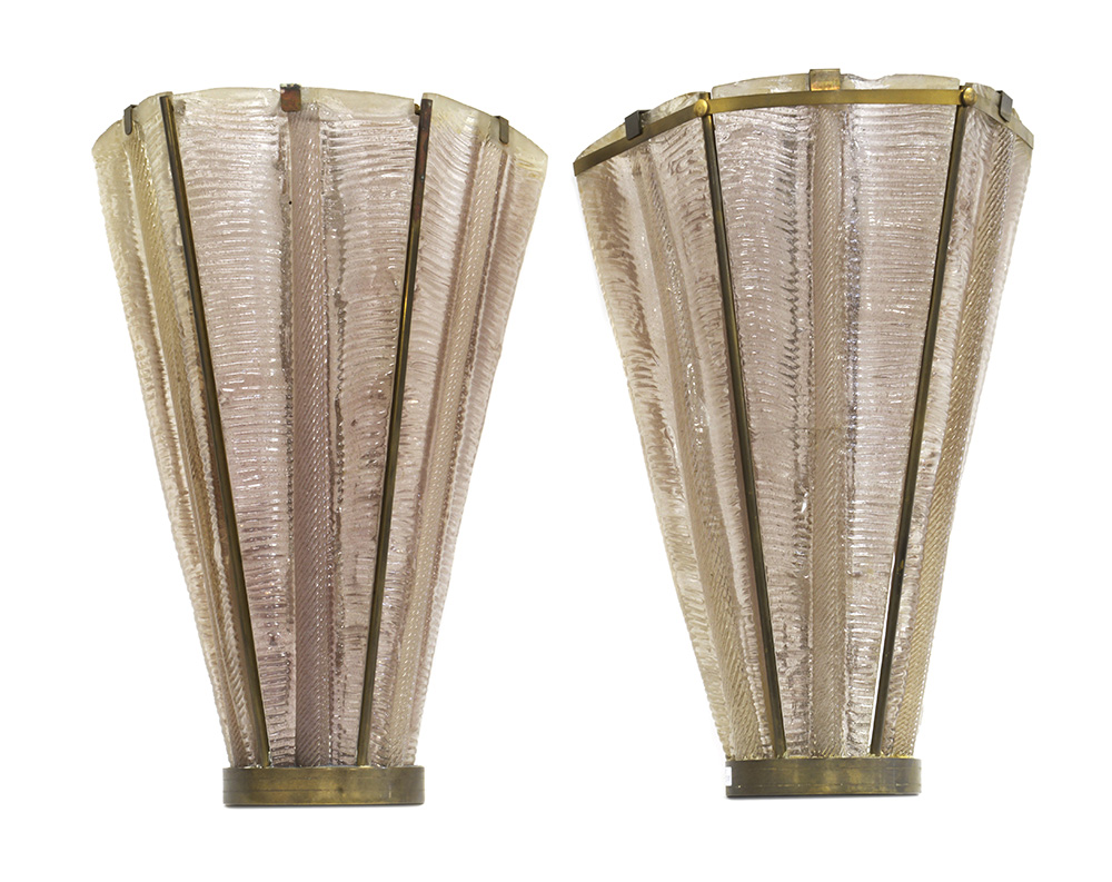 Coppia di grandi appliques in vetro ametista chiaro stampato a rilievi e con inclusione di bolle. Anni '30/'40. (cm 34x51x18,5) (gravi difetti e restauri)
