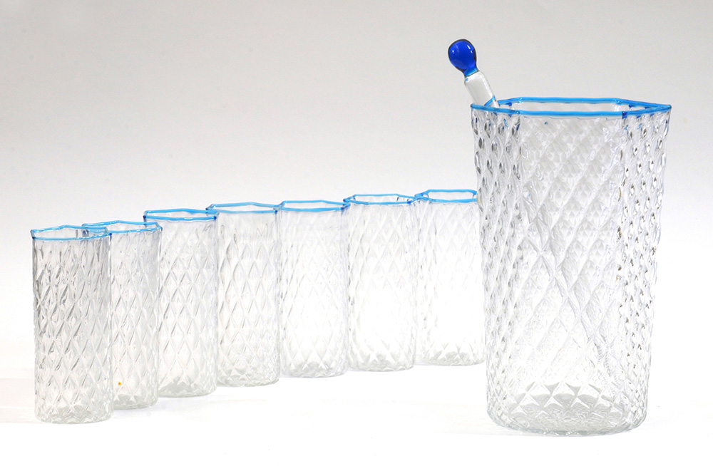 Servizio composto da sette bicchieri, una caraffa con bacchetta in vetro trasparente con orlo azzurro con lavorazione a "balloton". (Misure diverse) (difetti)