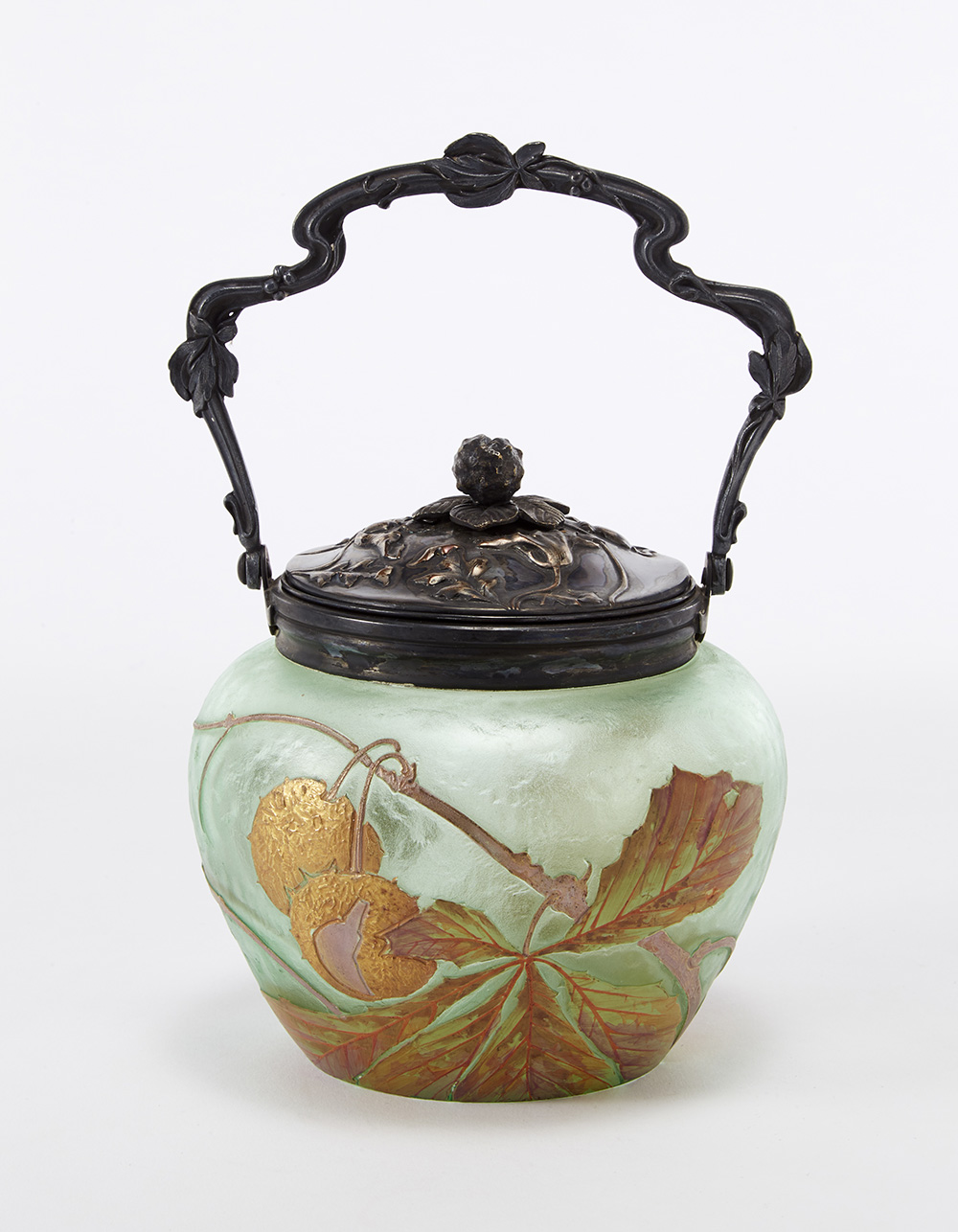 Contenitore Art Nouveau in vetro trasparente verdino corroso all’acido e decorato con motivi vegetali, coperchio in metallo argentato