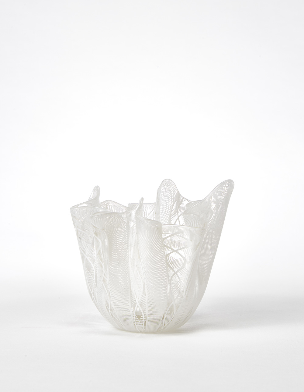 Piccolo vaso "fazzoletto" a canne di zanfirico in vetro incolore e lattimo. Venini, Murano, anni '60. Firmato all'acido "venini murano" e recante etichetta originale. (h cm 12,5)