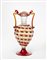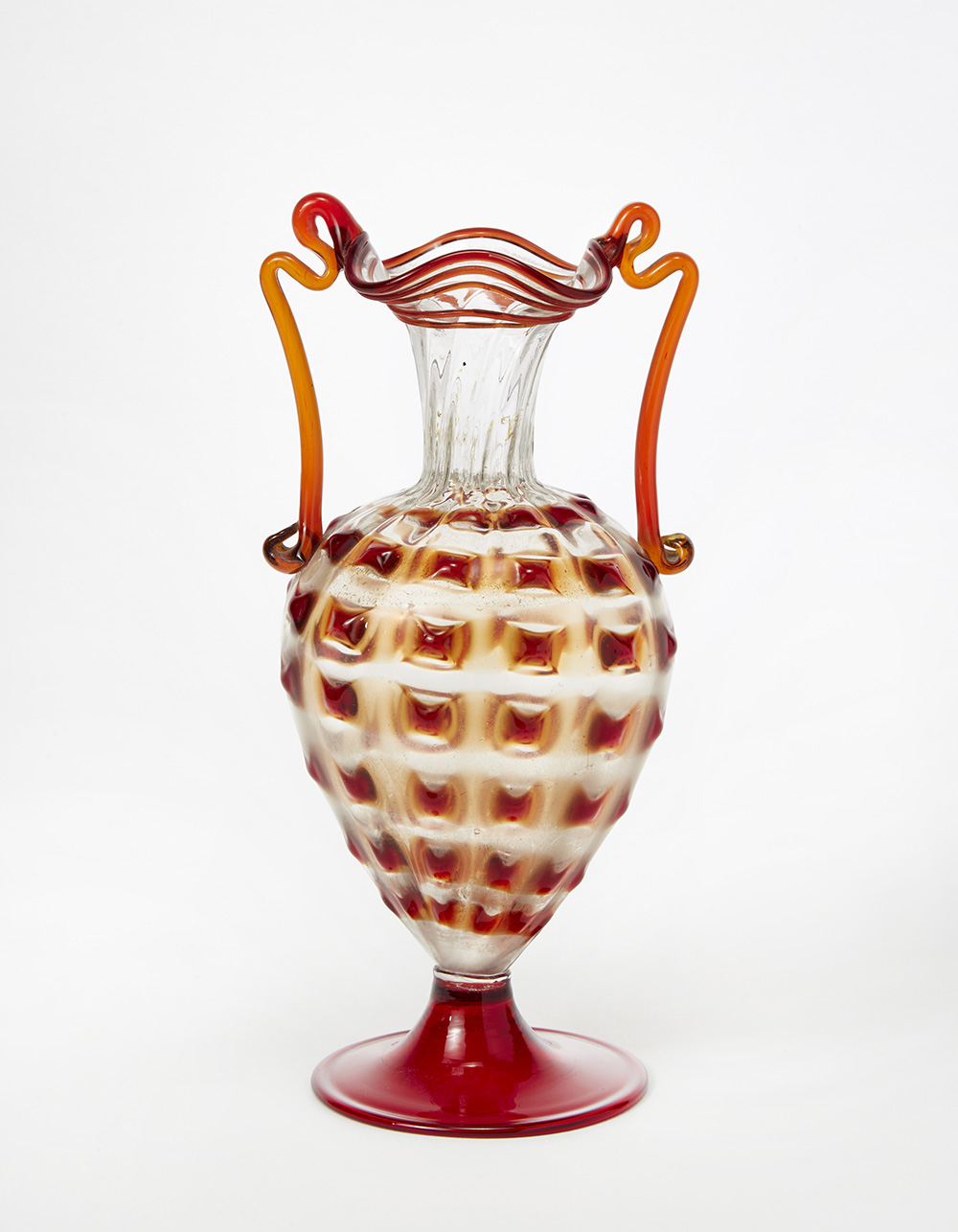 Vaso biansato a corpo costolato, orlo ondulato ed anse a riccioli. Murano, anni '20/'30. Vetro soffiato incolore con applicazioni bugnate, anse e base in vetro rosso trasparente. (h cm 27,5)