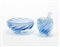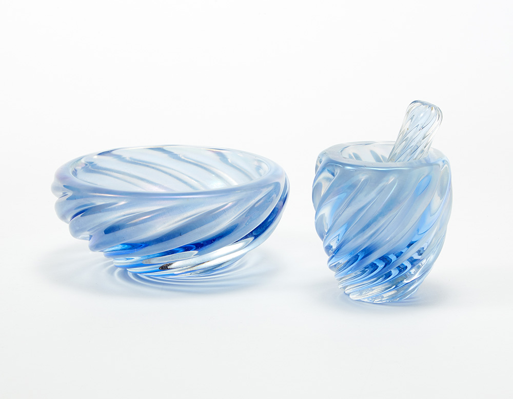 Set composed of a mortar with pestle and a bowl in colourless torquoise solid glass with twisted ribs. Iridescent on the external surface. 1940s/1950s. (mortar: h 8 cm. d 16.5 cm.; bawl: h 10 cm. d 9 cm.)
