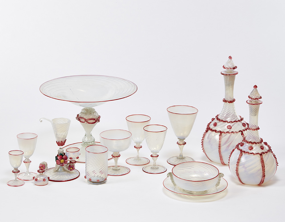 Servizio in vetro soffiato opalescente trasparente lavorato a costolature ritorte con applicazioni in vetro rosato, composto da due bottiglie con tappo, sei coppe, trentacinque calici di diversa altezza, sei bicchieri, tre ciotole, due piattini unito a un'alzata e un bicchiere. Anni '20. (misure diverse) (difetti e mancanze)