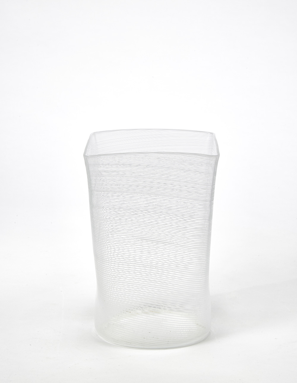 Vaso a sezione quadrangolare in vetro soffiato incolore a mezza filigrana lattimo. Venini, Murano. Corrispondente al disegno 3611 dei lattimi del Catalogo Blu Venini. Tracce di firma all'acido "Venini Murano" sotto la base. (h cm 19)