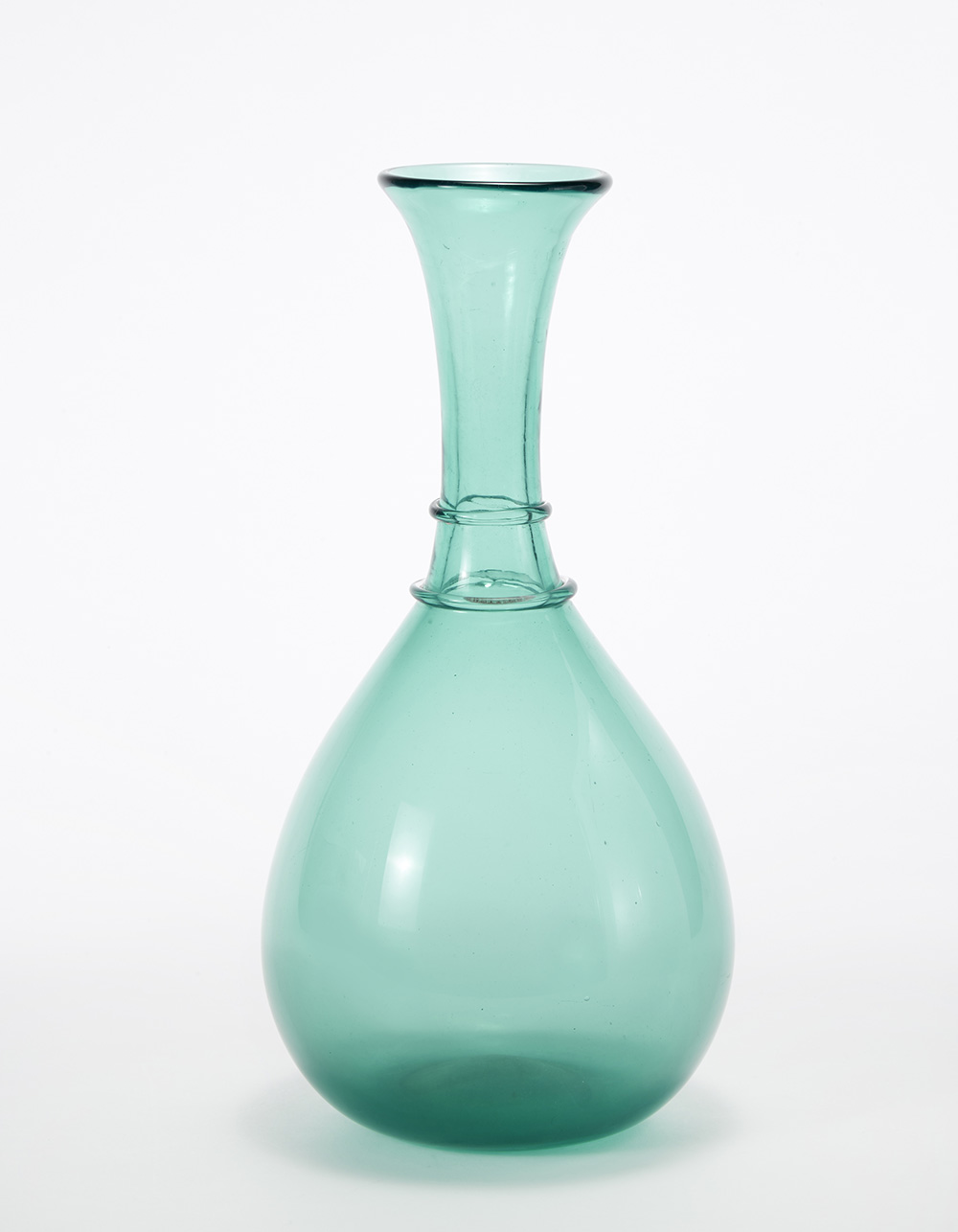 Vaso in vetro trasparente pesante verde. Disegno n. 1522 del catalogo Venini degli anni 20, in origine disegnato da Vittorio Zecchin e ripreso da Paolo Venini. Venini, Murano, 1952ca. Firmato all'acido sotto la base "Venini MURANO ITALIA". Recante etichetta cartacea Venini degli anni 50 con iscritto codice 1522. (h cm 45)