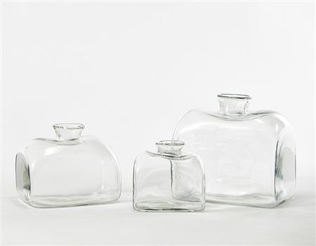 Lotto composto da tre vasi quadrangolari a collo stretto, in vetro trasparente incolore. Murano, anni '70. (MIsure diverse)