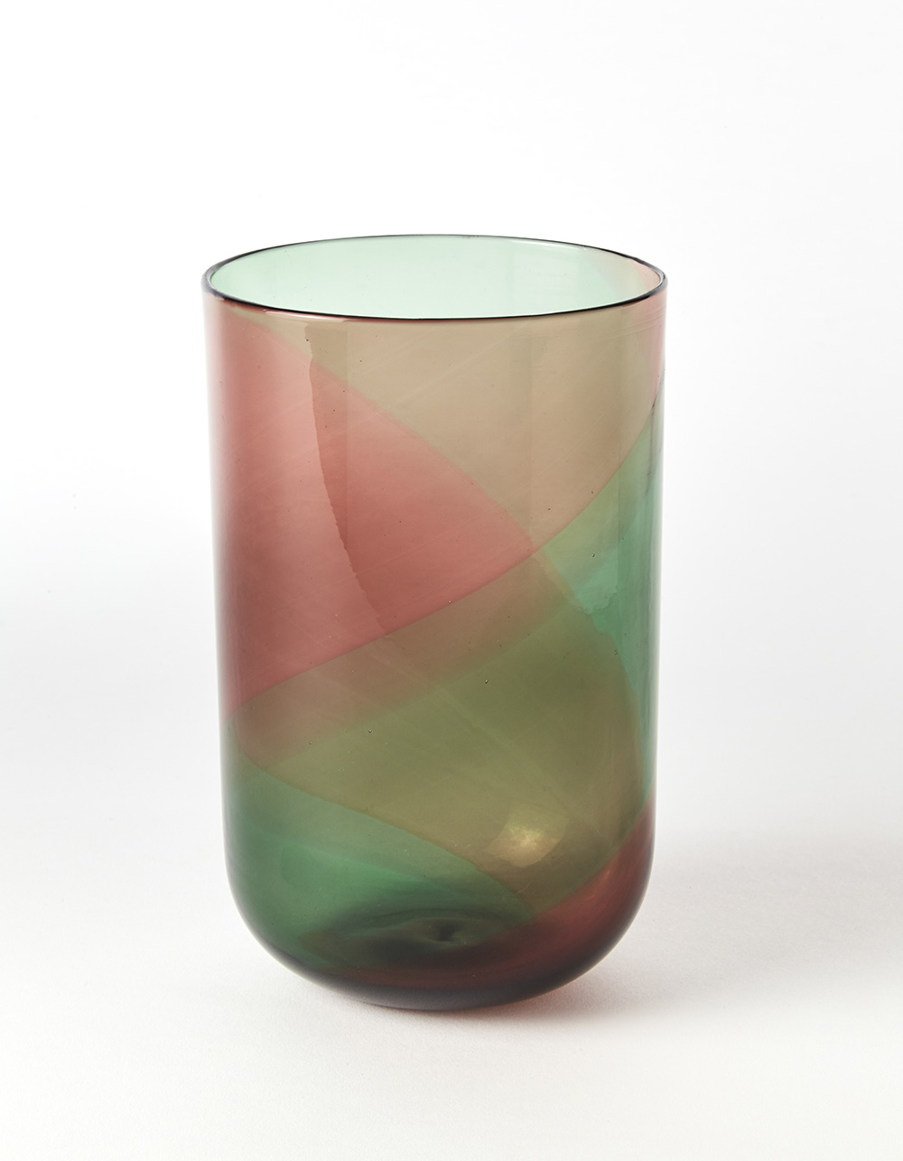 Vaso della serie "Coreani". Venini, Murano, 1966. Vetro soffiato trasparente colori viola e verde mela sovrapposti a spirale. Disegno n. 505.2 del Catalogo Verde Venini. Firmato "venini italia" e datato a punta sotto la base. (h cm 20,5; d cm 14)