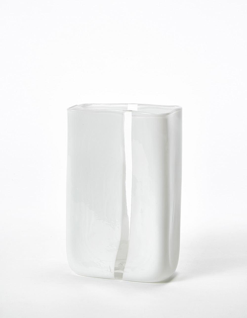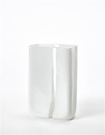 Vaso prismatico della serie "716". Venini, Murano, 1964/1965. Vetro soffiato lattimo con due righe verticali incolore. Firmato a punta sotto la base "Venini italia". (h cm 22)