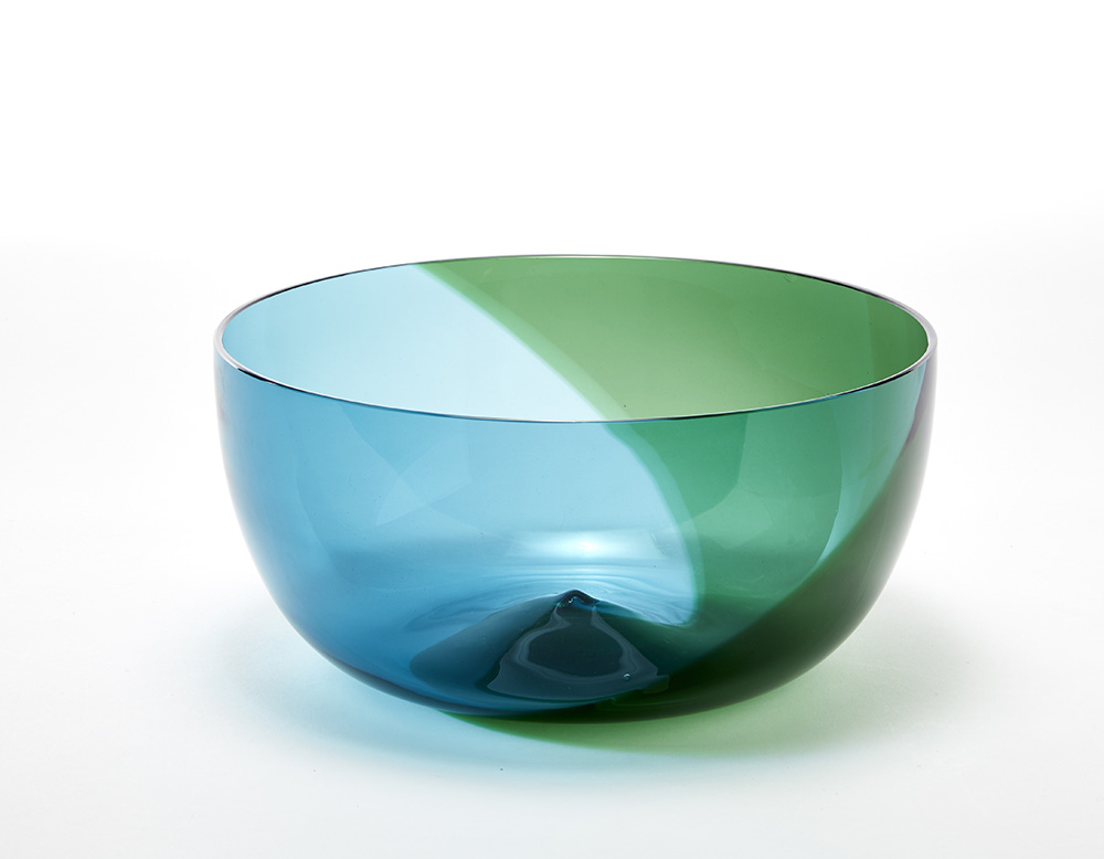 Vaso della serie "Coreani". Venini, Murano, 1988. Vetro soffiato trasparente nei colori blu e verde mela sovrapposti a spirale. Disegno n. 505.5 del Catalogo Verde Venini. Firmato a punta sotto la base "Venini 88 TW". (h cm 14; d cm 30)