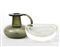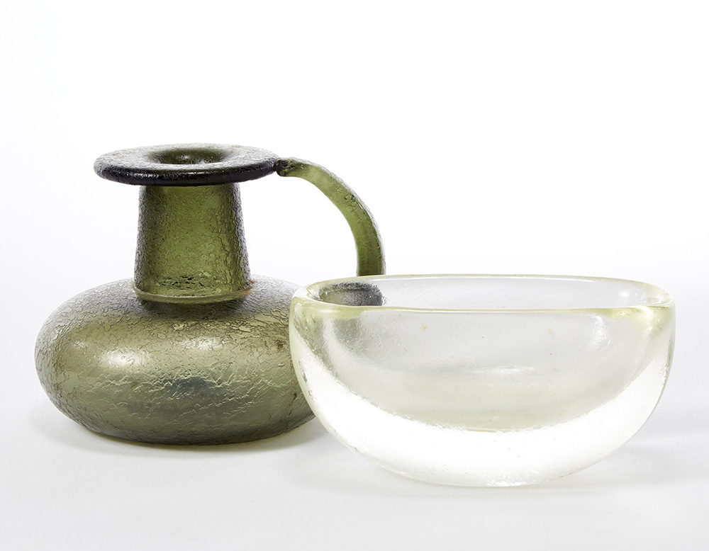 Lotto composto da una brocca in vetro soffiato verde trasparente corroso e una ciotola in vetro incolore corroso. Murano, anni '50. (h cm 16)