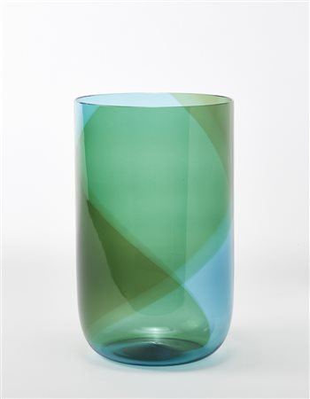 Vaso della serie "Coreani". Venini, Murano, 1986. Vetro soffiato trasparente nei colori blu e verde mela sovrapposti a spirale. Disegno n. 505.0 del Catalogo Verde Venini. Firmato a punta sotto la base "Venini TW 86". (h cm 34; d cm 20)