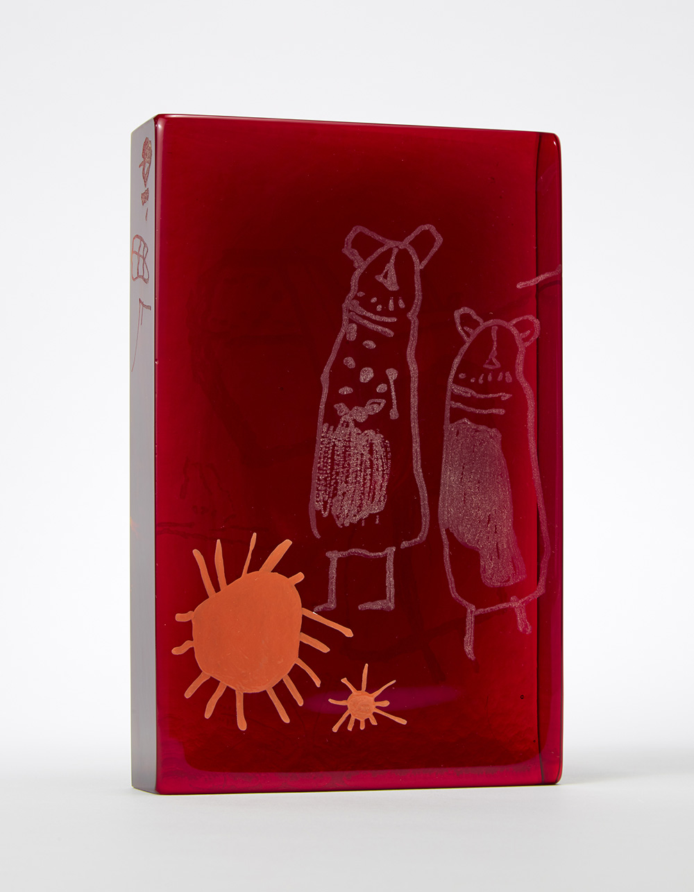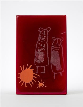Scultura in vetro massello rosso scuro graffita con figure e dipinta con due soli arancioni. Siglata sul fianco. (cm 14,5x22,5x4)