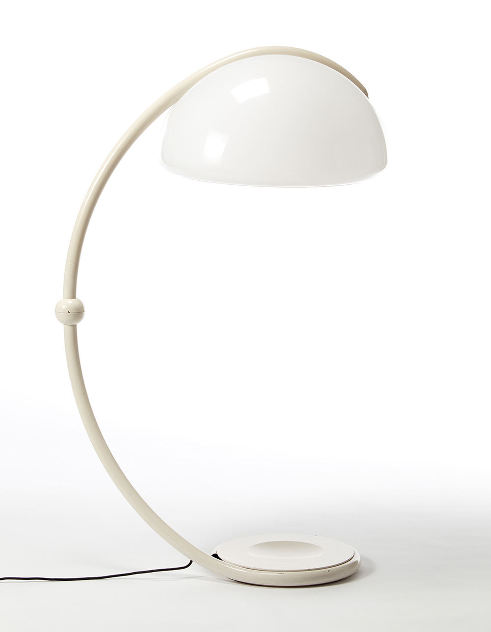 Lampada da terra modello "Serpente". Produzione Martinelli Luce, Lucca, 1965. Metallo laccato bianco e perpex opalino. (h cm 120)