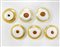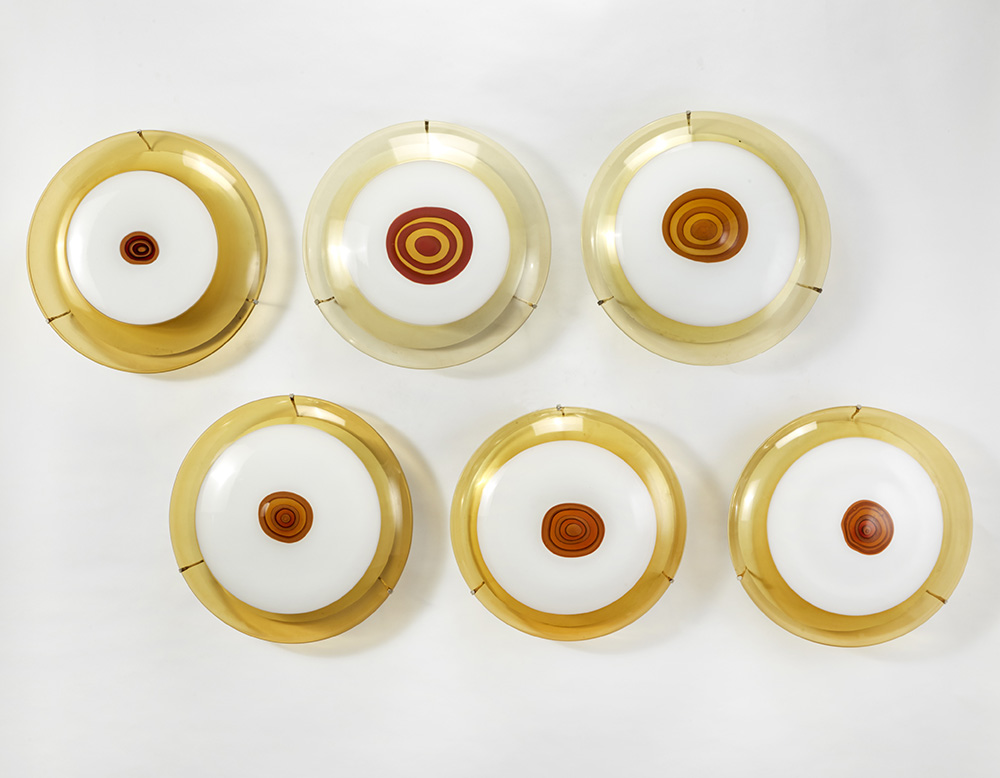 Sei lampade da parete in vetro soffiato ambrato e lattimo con struttura in metallo laccato bianco. La Murrina, Italia, anni '70. (d cm 40) (lievi difetti)