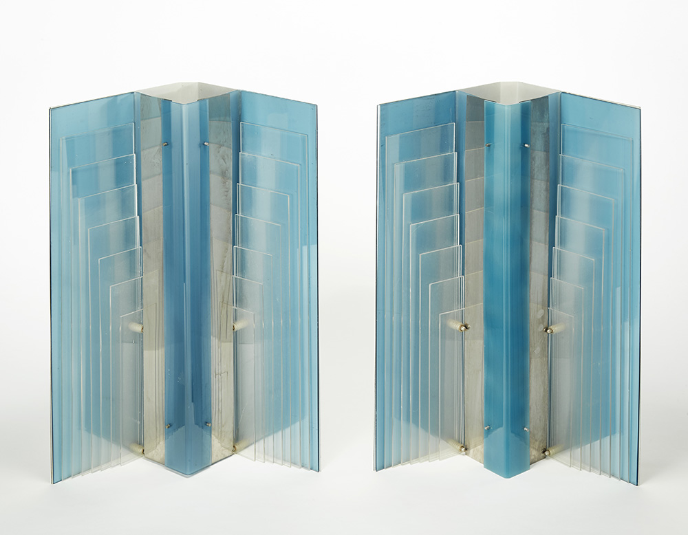 Pair of angular wall/table lamps in white lacquered metal sheet, steel and colorless and light blue plexiglass. Italy, 1970s. (40x60 cm.) (slight defects and minor losses)