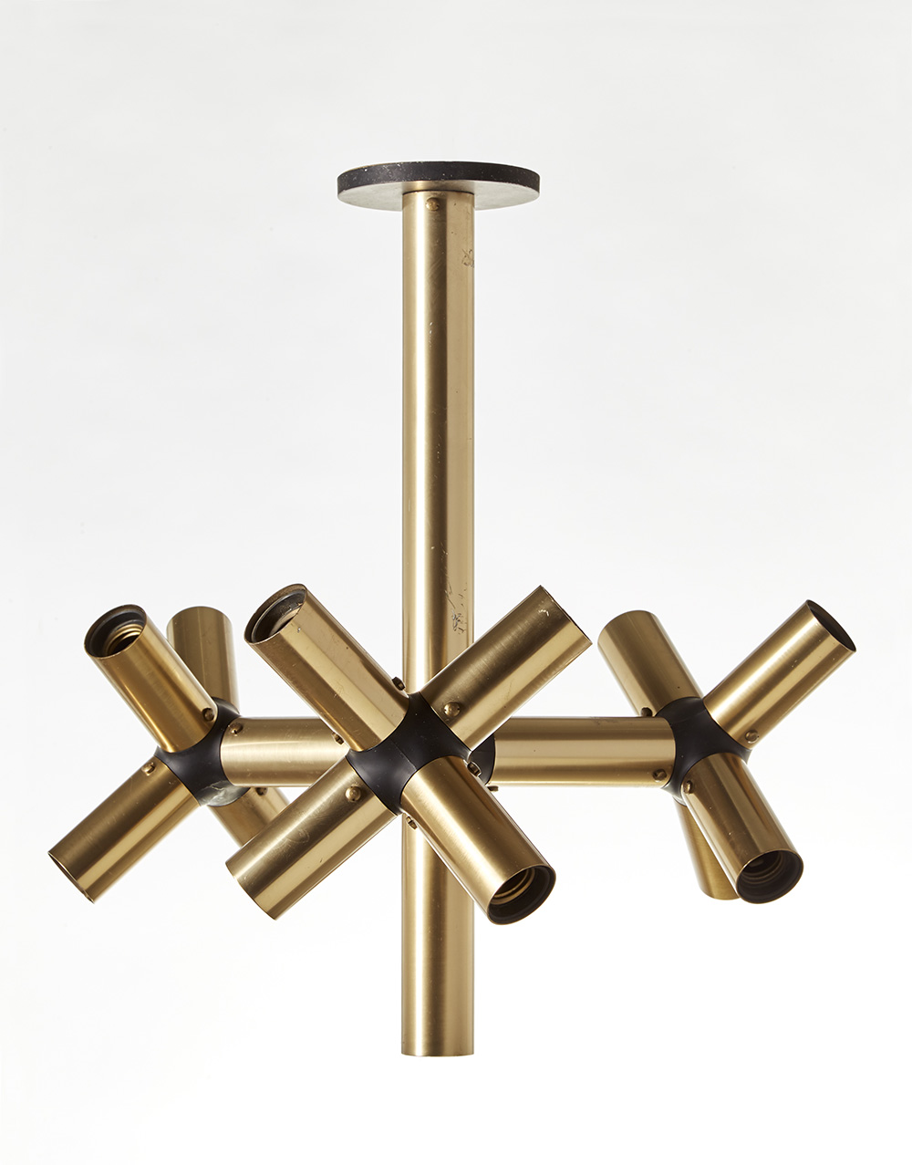 Lampada a sospensione a tredici luci modello "Atomic". Produzione Swiss Lamps International, Svizzera, 1956. Alluminio ottonato e plastica nera. (cm x50x45) (lievi difetti)