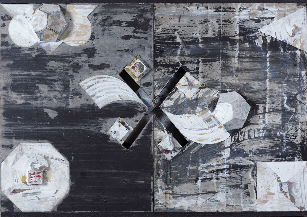 BRUNO CECCOBELLI Montecastello Vibio (Pg) 02/09/1952 - Io fui come la nebbia tra voi, 1992, olio e collage su legno con parti richiudibili cm. 92x260x17 aperto (92x130x17 chiuso), firma, titolo, anno ed etichetta della mostra tenutasi presso la Galerie Hadrien Thomas (Paris) dal 19 marzo al 16 maggio 1992 al retro, dichiarazione d'autenticità e archivio dell'artista su foto, opera senza cornice.