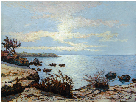 GINO ROMITI Livorno 1881 – Livorno 1967 Mattina Olio su faesite 30 x 40. Firma in b. a d.; sul verso firma + timbro e firma illeggibili + altro timbro con scritte descrittive dell’opera e firma galleria Romano Stefanini, Livorno. B.A.: 500