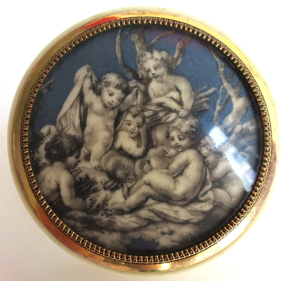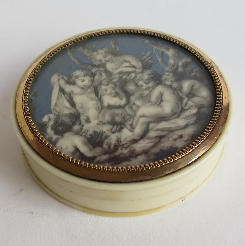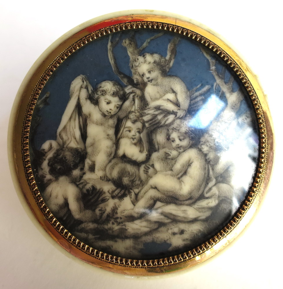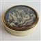 SCATOLA Tonda in avorio con 2 miniature - cm 7.7 x 2.3 - sec XIX - Francia