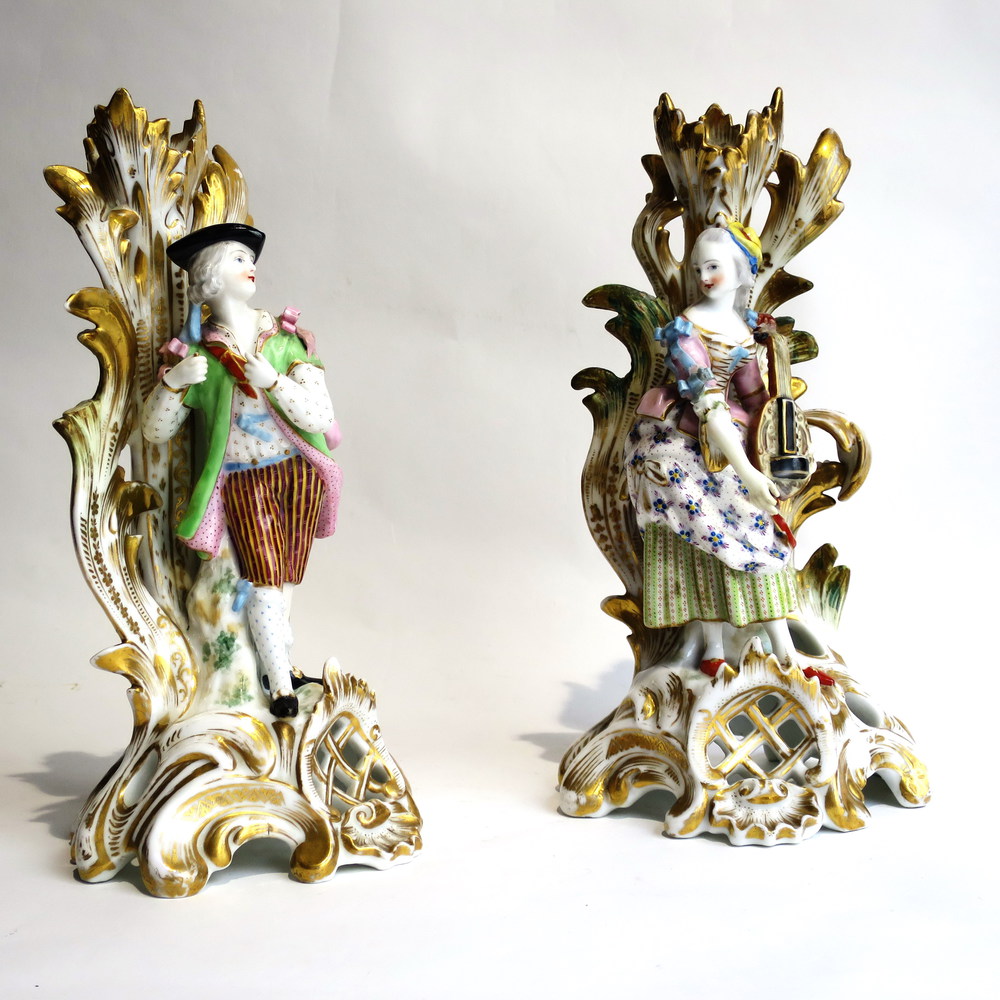 COPPIA CANDELIERI Coppia di porta steli in porcellana policroma "figure giovanili" H: cm 27 Francia. Difetti