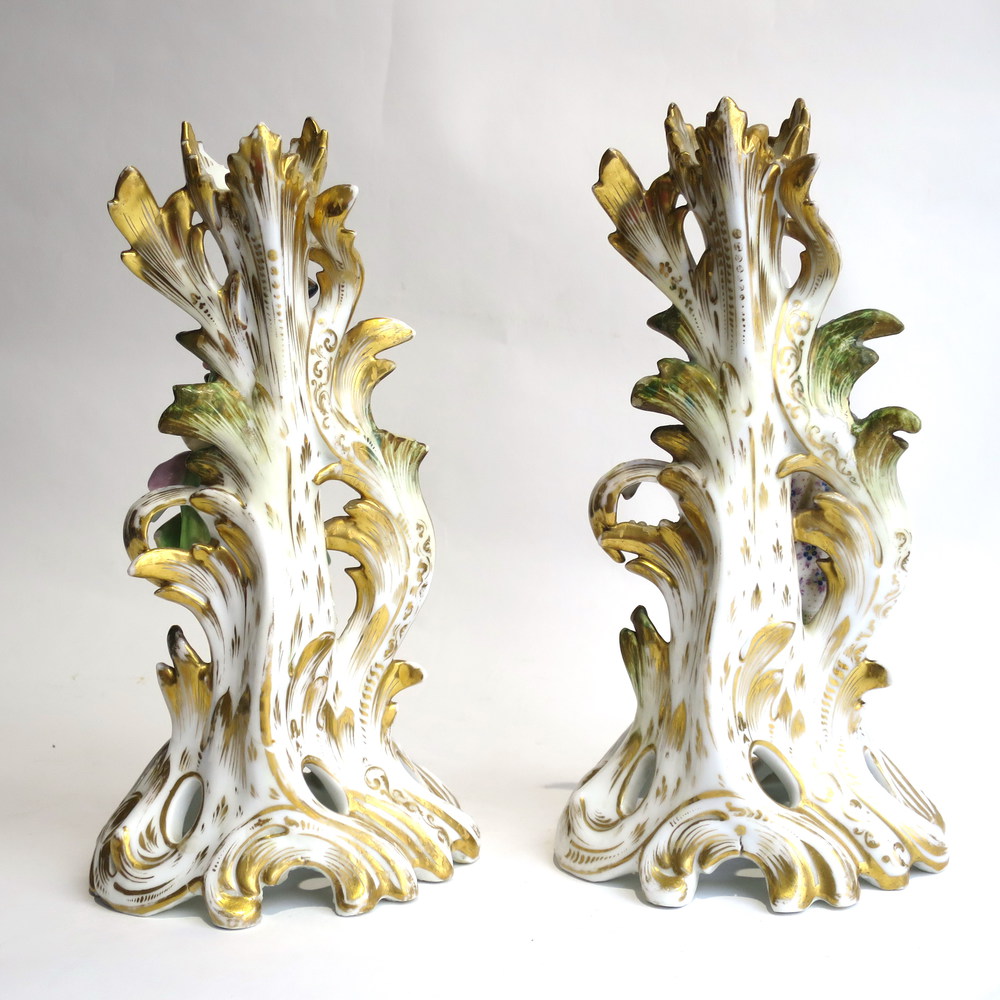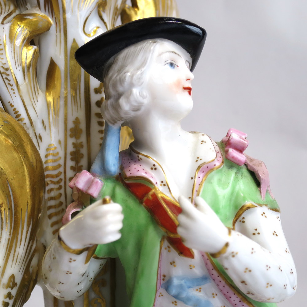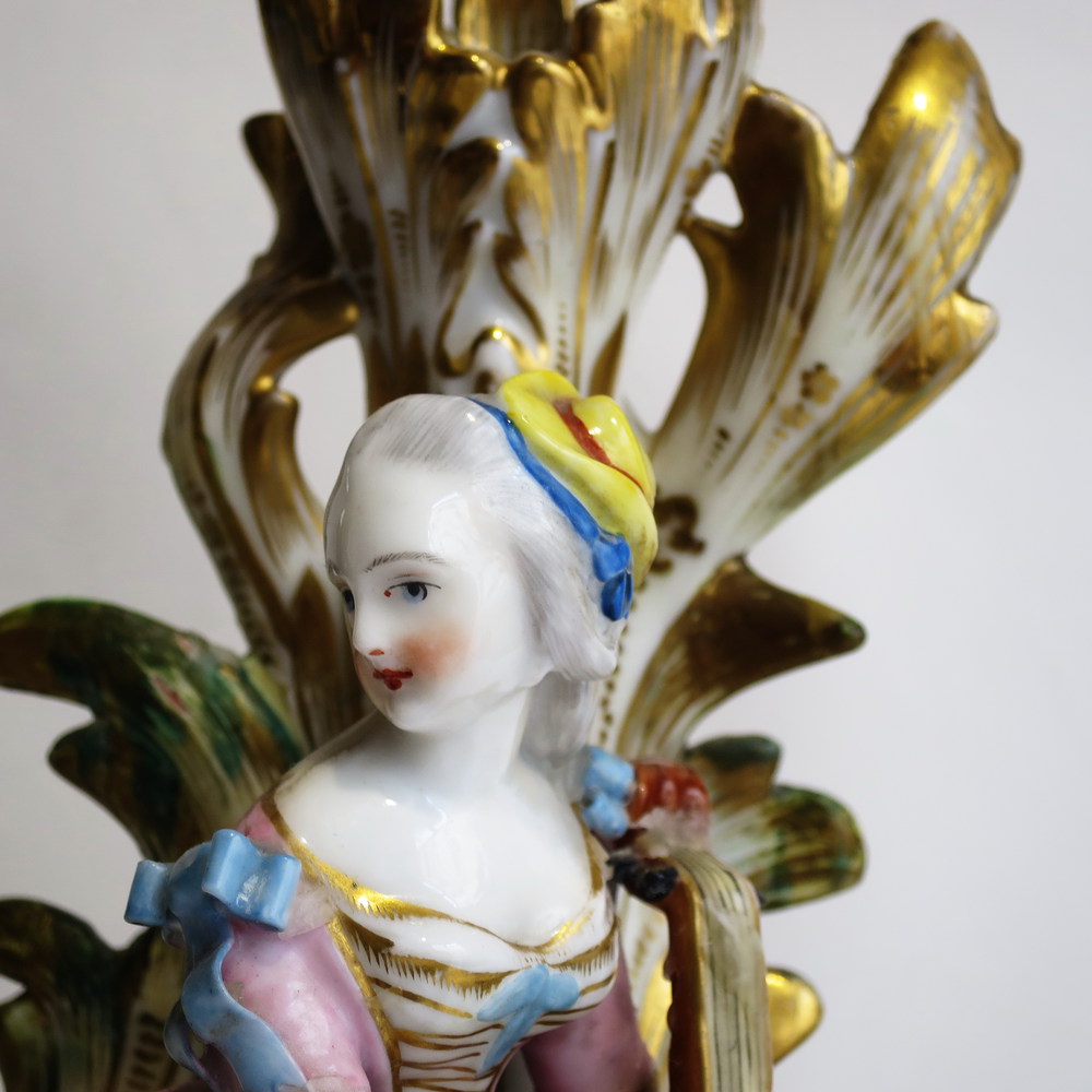 COPPIA CANDELIERI Coppia di porta steli in porcellana policroma "figure...
