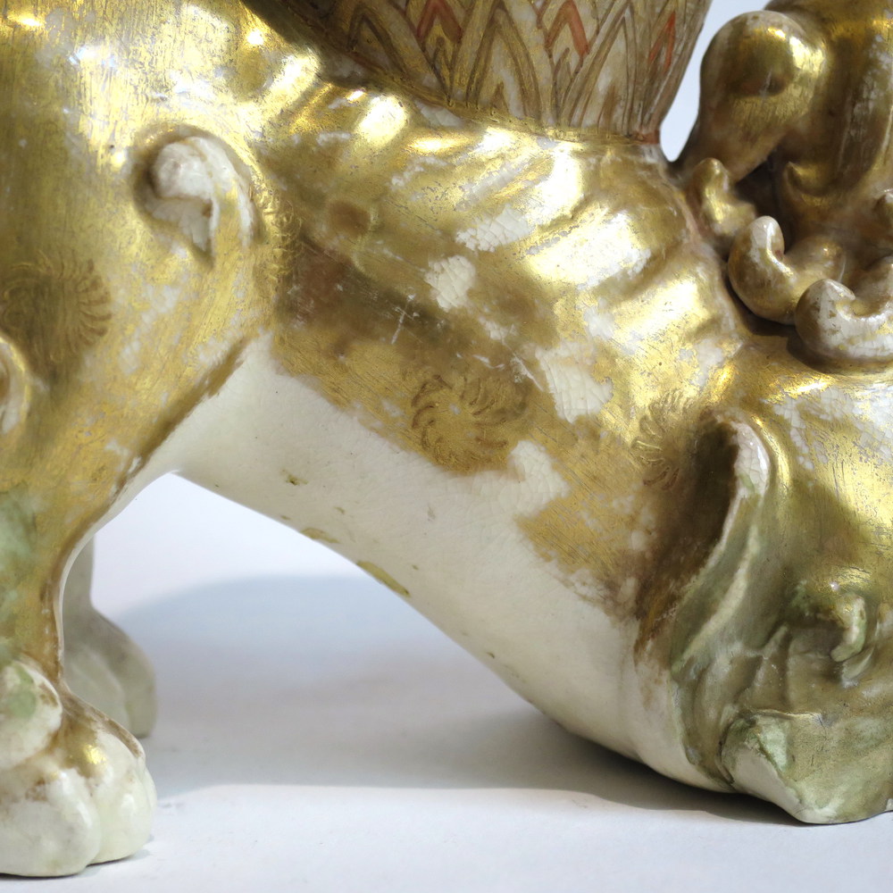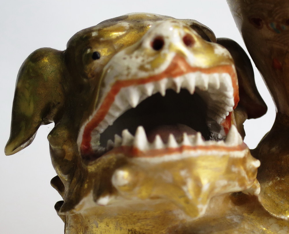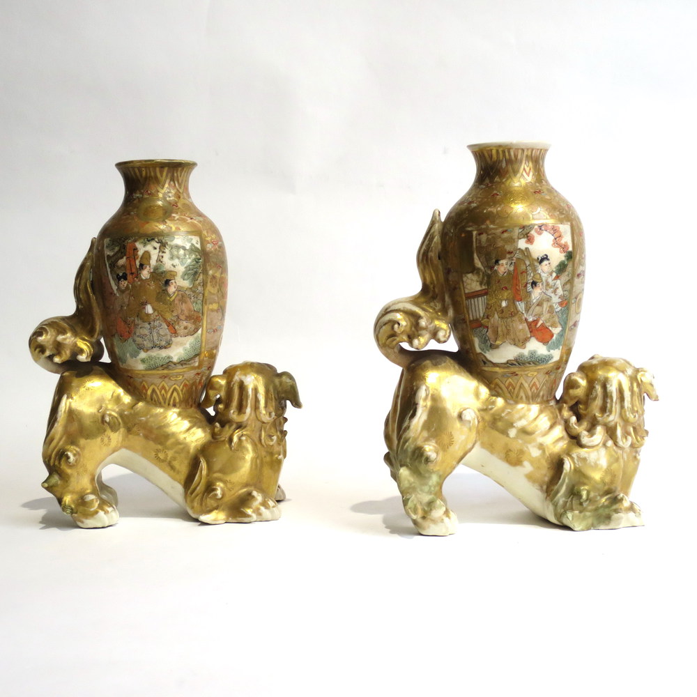 SATZUMA Coppia di vasi in porcellana decorata e dorata poggianti su cane di...