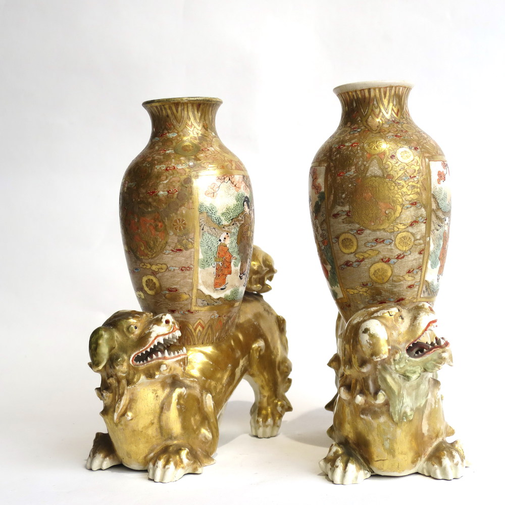 Lotto 223 | SATZUMA Coppia di vasi in porcellana decorata e dorata poggianti su cane di...