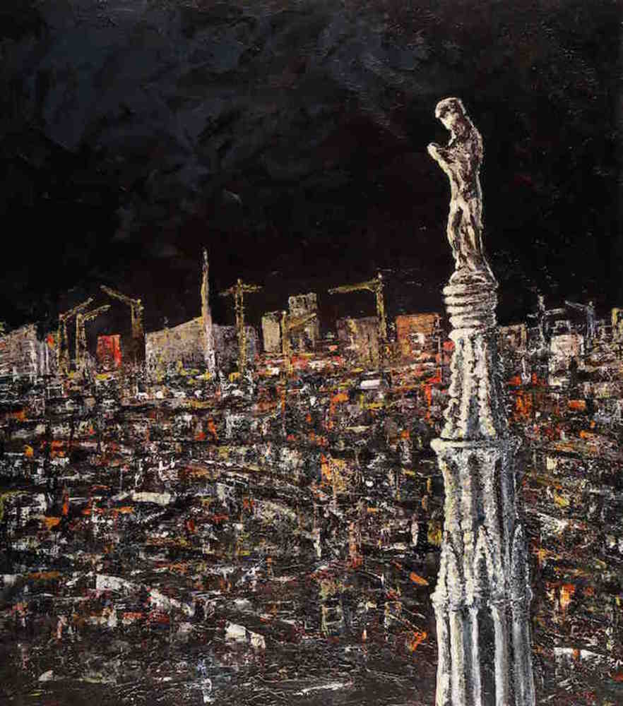 PIERLUCA BENCINI Acrilico su tavola "Civitas Hominum" cm 90x80 Pubblicata sul catalogo "Milano Vola Alto" di Roberto Ungaro (2014)