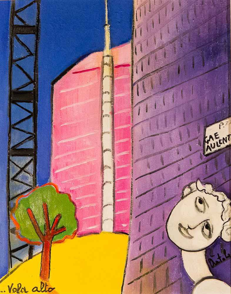 ANNA ANTOLA Tecnica mista su tela "P.zza Gae Aulenti" cm 40x50 Pubblicata sul catalogo "Milano Vola Alto" di Roberto Ungaro (2014)