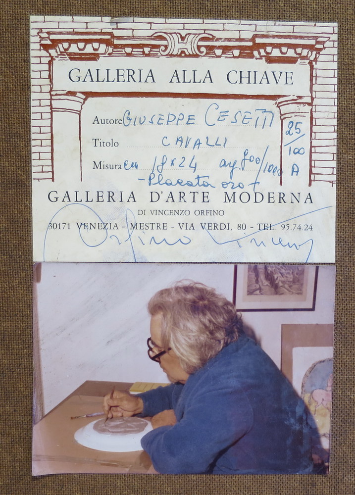 GIUSEPPE CESETTI (Tuscania 1902 – Tuscania 1990) "Cavalli" incisione su lastra d'argento dorata e laccata firmata e numerata sul retro 25/100 cartiglio della galleria e foto dell'artista sul retro cm 18 x 24