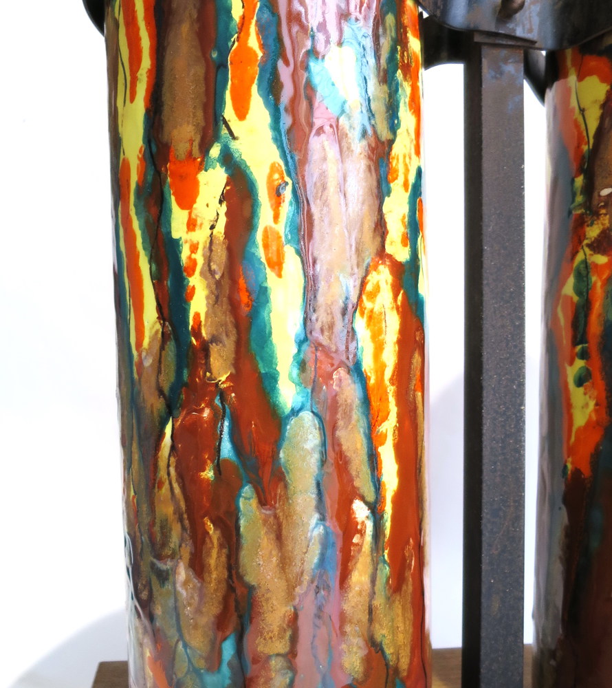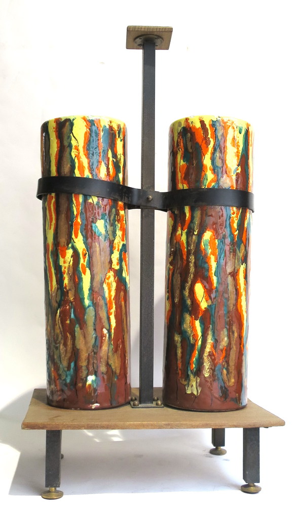 PORTA OMBRELLI in terra cotta smaltata a motivi informali base legno ferro e...