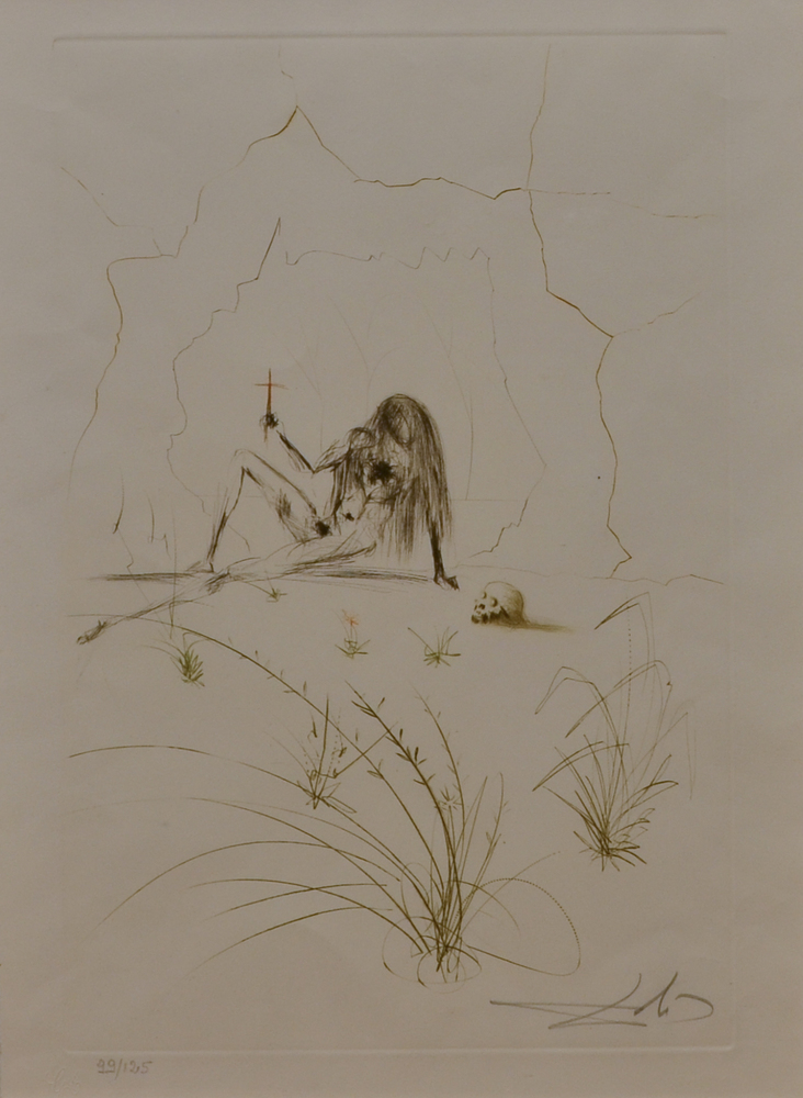 SALVADOR DALI' Acquaforte a colori firmata a mano e numerata 99/125 tratta da Tristano e Isotta "Ogrin, l'eremita" cm 40x26,5 Pubblicata su Catalogue Raisonnè of Etchings and Mixed Media Prints Tristano e Isotta, i due amanti, ormai costretti a una vita di stenti nella foresta di Morois per sfuggire all'ira del re Marco, marito di Isotta, si rendono conto che la loro passione non vale tante pene e tanta miseria e incaricano Ogrin di trattare un rientro dignitoso a corte.