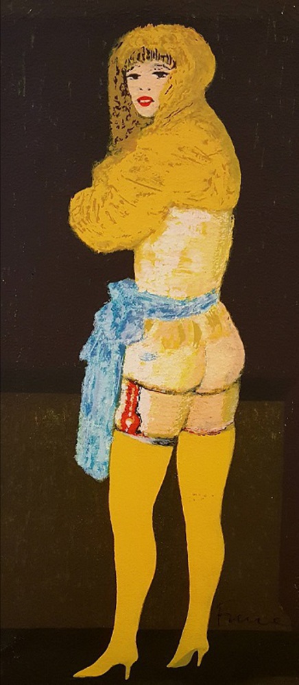 SALVATORE FIUME Serigrafia pastellata su tela "Modella con calze gialle" cm 38x80