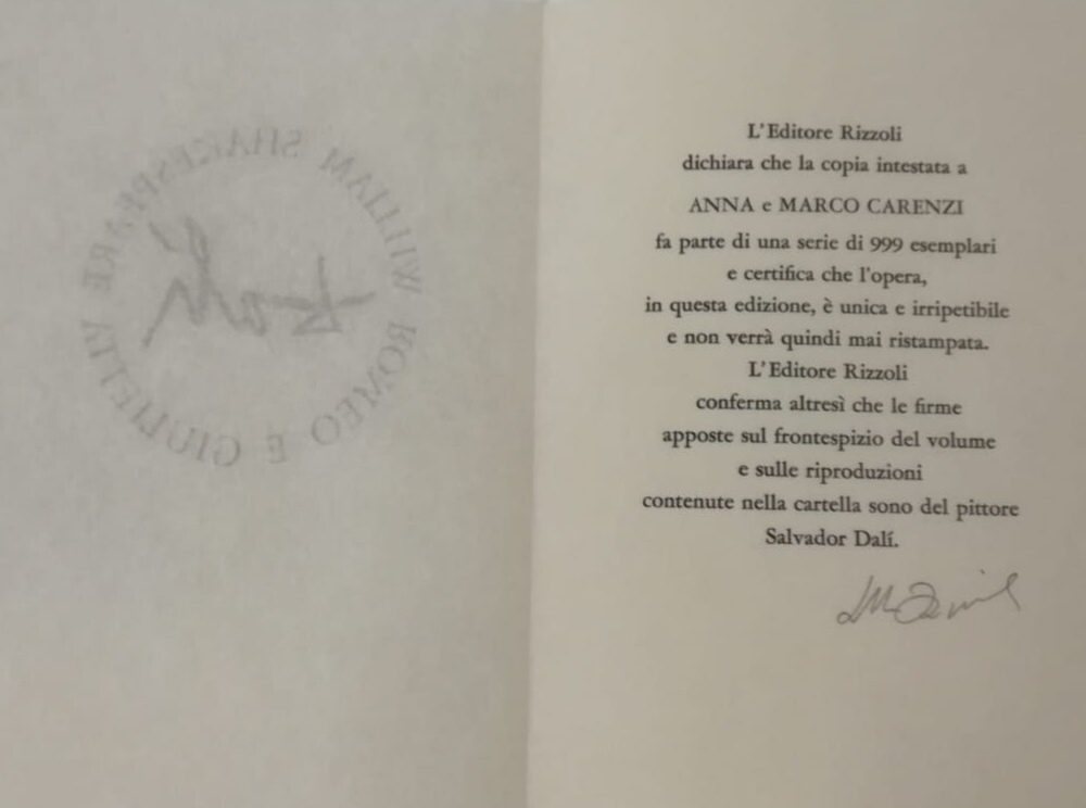 SALVADOR DALI' Libro d'artista "Romeo e Giulietta" con dieci litografie all'interno ciascuna firmata con matita blu a mano - Colophon firmato a matita rossa a mano - Realizzato per Rizzoli Arte - Edizione di 999 esemplari - 1975 - cm 35 x 41 x 3