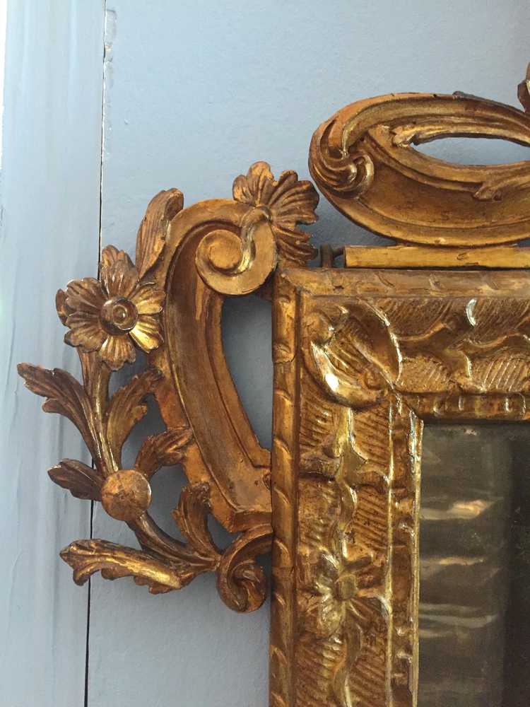 SPECCHIERA Specchiera in legno di tiglio dorata e intagliata con cimasa traforata Lombardia XIX sec.