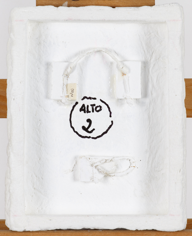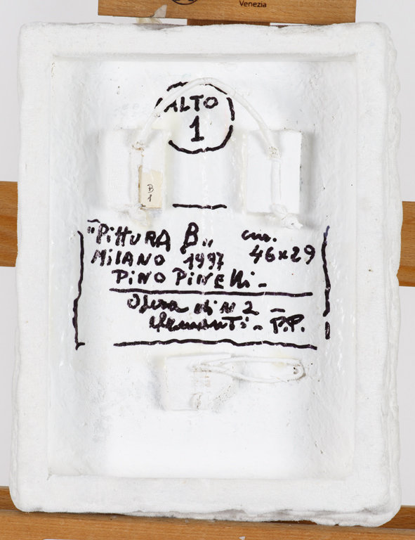 Firma, titolo, datazione, misure, località (Milano), iscrizione "Opera di N.2 elementi" e indicazioni per il posizionamento al retro del primo elemento
