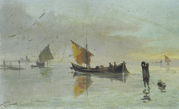 Scuola Veneta XIX sec. Alba in laguna Olio su tavola, cm. 16,2x26,5 Recante...