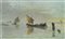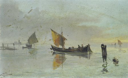 Scuola Veneta XIX sec. Alba in laguna Olio su tavola, cm. 16,2x26,5 Recante firma in basso a sinistra: V. Caprile. € 350/450
