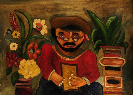 Giuseppe Serafini (Montelupo Fiorentino, 1915 - 1987) Ritratto con fiori Olio su cartone inciso, cm. 30x40 Firma in basso a destra e sul verso. € 250/350