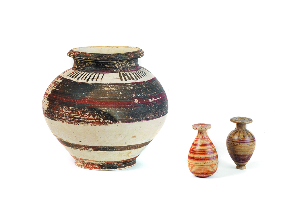 OLLA, ARYBALLOS E ALABASTRON ETRUSCO CORINZI DATAZIONE: inizi VI sec. a. C. MATERIA E TECNICA: argilla figulina camoscio; vernice bruna, suddipinture in bruno e paonazzo; modellati a tornio veloce Olla con labbro svasato, collo cilindrico a pro lo concavo, corpo ovoide, piede troncoconico; decorata con interno della bocca risparmiato, labbro e collo dipinti in bruno; sulla spalla gruppi di linguette; sul ventre fascia a bande alternate in bruno e paonazzo, parte inferiore del vaso risparmiata; alabastron a corpo espanso con bocchello a disco, collo indistinto dal corpo piriforme; fondo convesso, decorato sul collo con linguette radiali, sul corpo con fasce orizzontali con trattini obliqui alternate ad altre in bruno; aryballos piriforme con bocchello a disco, ansa a nastro impostata verticalmente dall’orlo alla spalla; corpo piriforme, peduccio a bottone, decorato sul bocchello con cerchi concentrici, sull’ansa con bande parallele, sulla spalla con linguette verticali, delimitate da linee in paonazzo; sul corpo con fasce e letti alternati in bruno e paonazzo (3) PRODUZIONE: ceramica etrusca centro-meridionale STATO DI CONSERVAZIONE: olla ricomposta da frammenti; integri gli altri due DIMENSIONI: alt. cm 21,5; diam. cm 14; alt. cm 9 e cm 9,1 PROVENIENZA: New Hermes Arte Antica, Arezzo